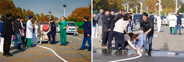 随着发令枪鸣响,比赛正式启动。各参赛职工精神抖擞、斗志昂扬,在赛场上争分夺秒、默契配合,充分展现我院职工良好精神风貌。本次运动会设置团体盘接水龙带接力、4×50米干粉接力灭火、运水灭火接力、火场救援等多个集体项目,既考验职工个人消防技能熟练度,又强调团队协作能力,巧妙将竞技性、趣味性与消防知识技能培训融为一体。