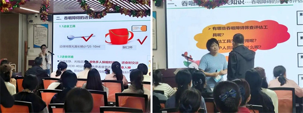 吞咽障碍是高龄老人常见的照护难题,也是引发误吸、窒息的高危因素,直接关系到老年照护的安全底线。本次培训精准聚焦一线照护高频痛点,由总护士长宋暖、神经内科二病区护士长陈硕围绕“吞咽障碍老人安全进食与急救”主题开展授课,两位老师结合老年群体生理特点,从吞咽生理解剖、进食风险评估、误吸预防要点等方面层层拆解,将专业理论知识与临床实操经验相结合,讲解通俗易懂、贴合实际。