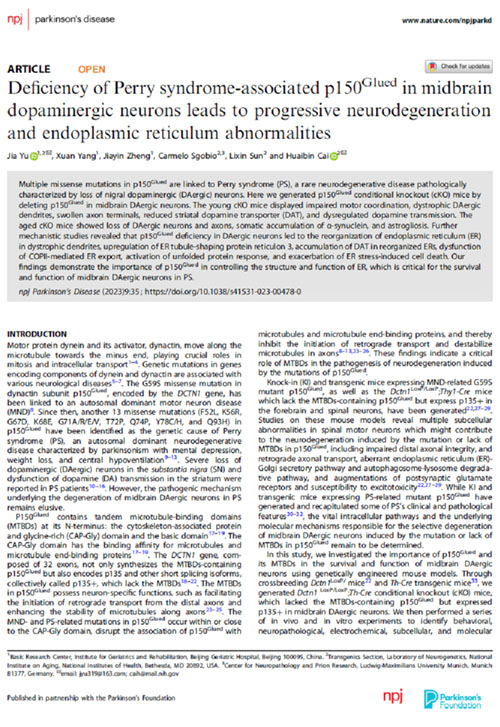 最新研究成果以“Deficiency of Perry syndrome-associated p150Glued in midbrain dopaminergic neurons leads to progressive neurodegeneration and endoplasmic reticulum abnormalities”为题,于2023年3月7日在线发表于Nature合作期刊npj Parkinson’s Disease杂志。