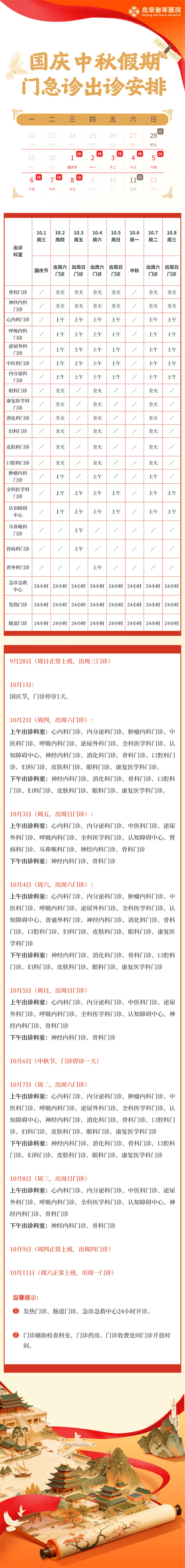 北京老年医院2025年国庆、中秋假期门急诊出诊安排
